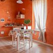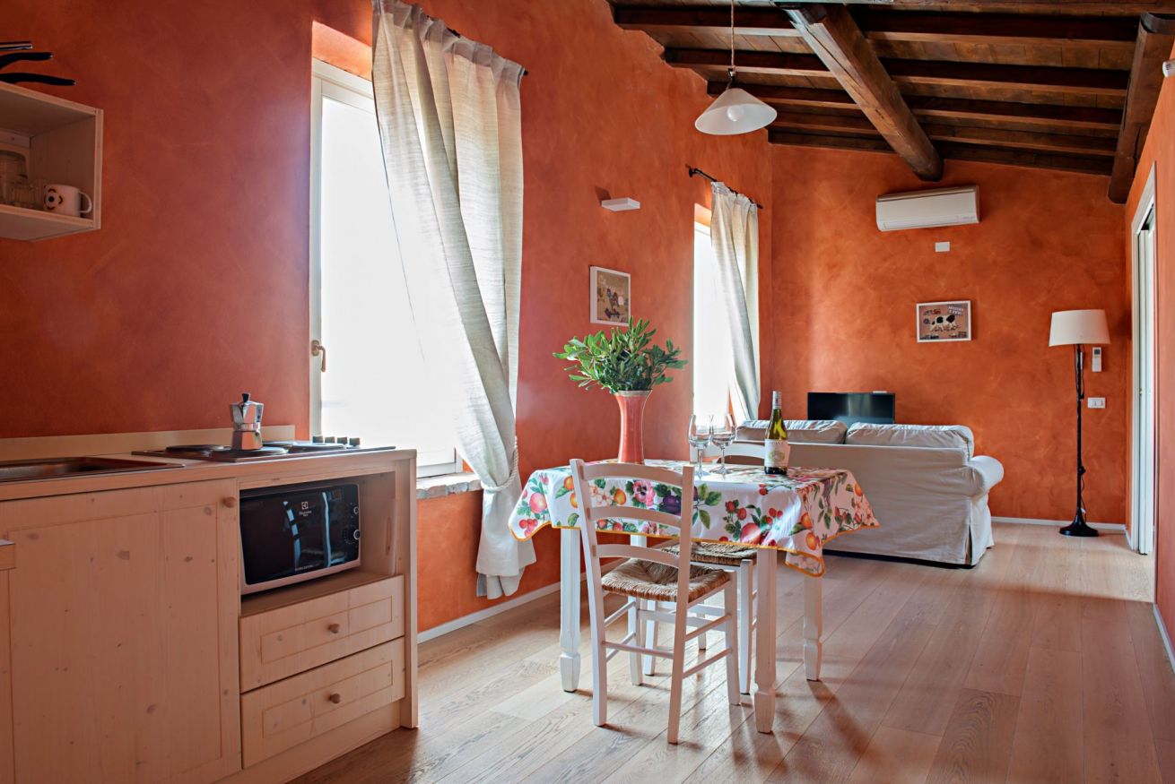 L’appartamento Castello affaccia sulla corte e la vecchia aia ed è composto da camera matrimoniale, un soggiorno con cucina, e un bagno con doccia.